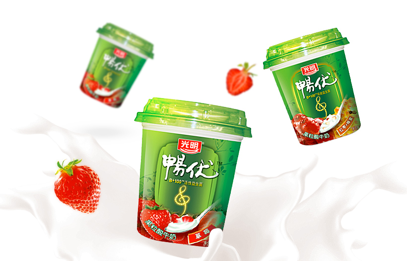 光明乳业是中国领先的乳制品制造商之一,以高端酸奶品牌“畅优”著称,其中含有一系列独创的B+100益生菌,有助于增进消化系统健康。2007年,光明乳业推出230克大果粒新系列美味酸奶,其包装体现了新鲜水果的清爽和饱满感。