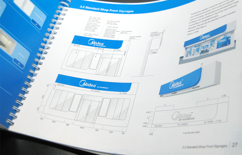 Bamboo Design was asked to develop a visual identity system for Midea's retail outlets and offices. The guide would be used to help establish a consistent brand image overseas, however it also needed to be sufficiently flexible to meet the unique needs of each individual market.